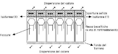 A partire da questa temperatura e da quel momento specifico il raffreddamento si attuerà attraverso una contrazione del solido identificato dai puntini [ (•••) di uguale volume]; se si avesse un solo centro di contrazione termica, la fratturazione di un corpo sostanzialmente isotropo (ovvero omogeneo in ogni sua parte), dovrebbe avvenire in maniera concentrica; in realtà essendo la colata lavica disomogenea per composizione chimica, si avranno diversi centri di contrazione termica, per cui la figura geometrica che meglio riempirà il piano sarà la maglia esagonale, quindi si creeranno delle fratture che si intersecheranno secondo angoli di 120°, il che darà luogo a dei grossolani prismi a base esagonale, "i più perfetti", o pentagonale o quadrangolare. Tutto